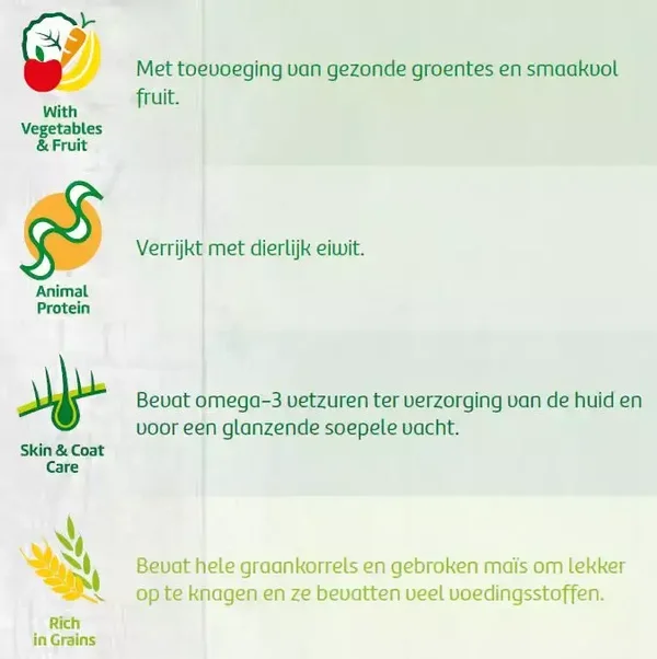Het bevat tevens dierlijke eiwitten.