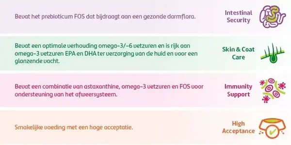 Bevat een combinatie van astaxanthine, omega-3 vetzuren en FOS voor ondersteuning van het afweersysteem.