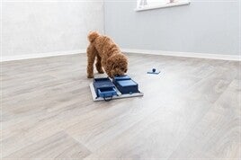 De hond zal deze ruiken, maar zal verschillende technieken moeten toepassen om bij de brokjes of snacks te komen.
